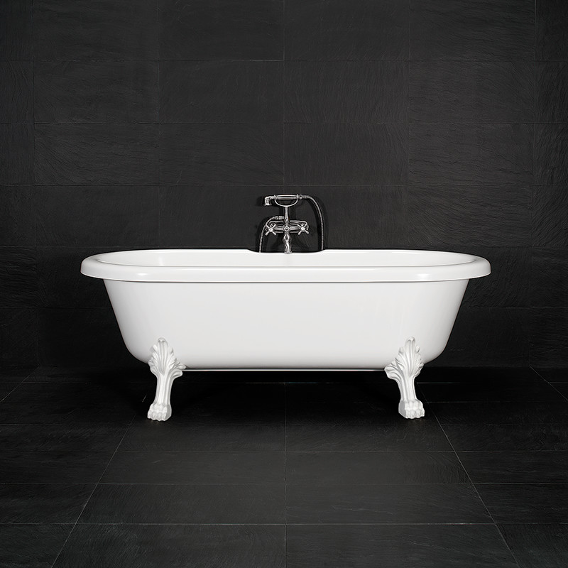 Ett stilrent klassist badkar i gjutmarmor med raka former. Lejontassar finns i tre olika färger, karet i vitt.