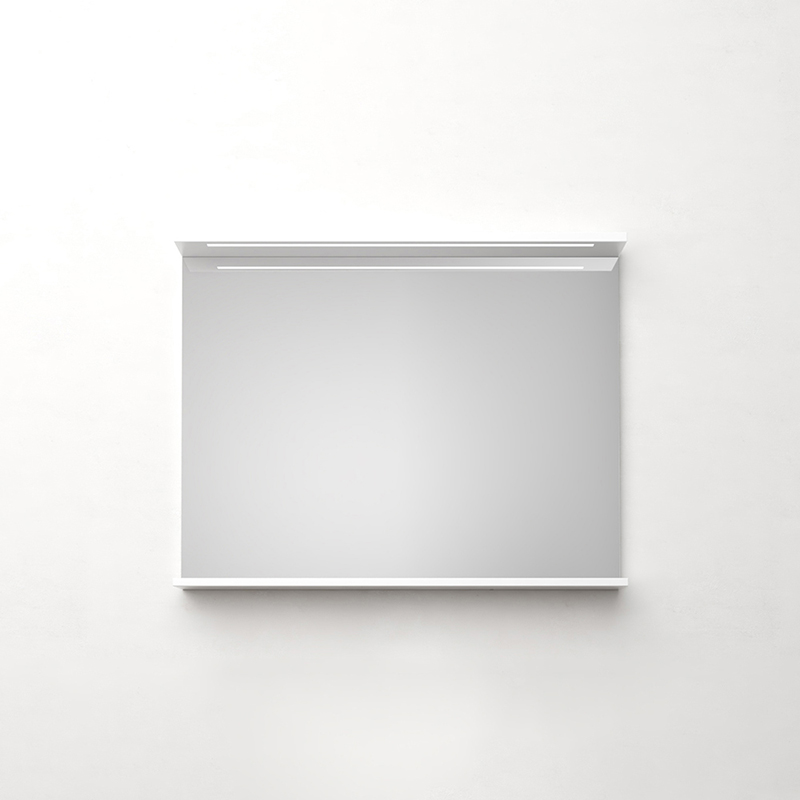 Spegel med funktionell belysning och infälld LED-profil med varmvitt ljus. Praktisk hylla för avställning. Enkel installation för en person med justerbar upphängningsregel. Förberett för el-installation. IP24.