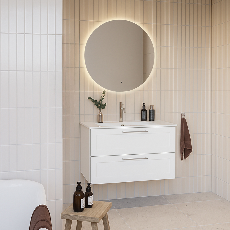 Spegelns ljus är varmvitt, och tack vare den inbyggda minnesfunktionen återställs din favoritinställning varje gång du tänder spegeln. Sol spegel med belysning är IP44-klassad (striltät) och anpassad för badrumsmiljöer.