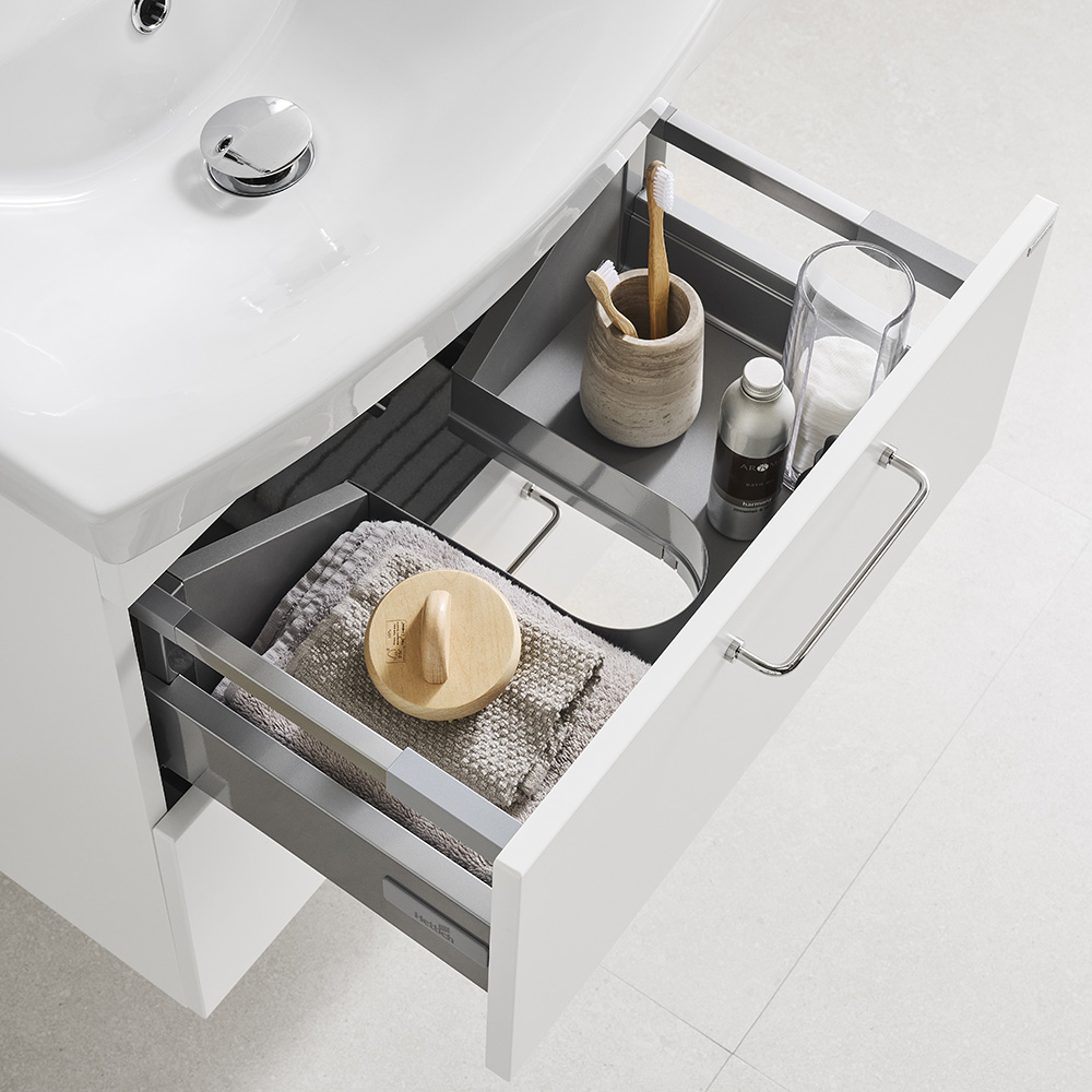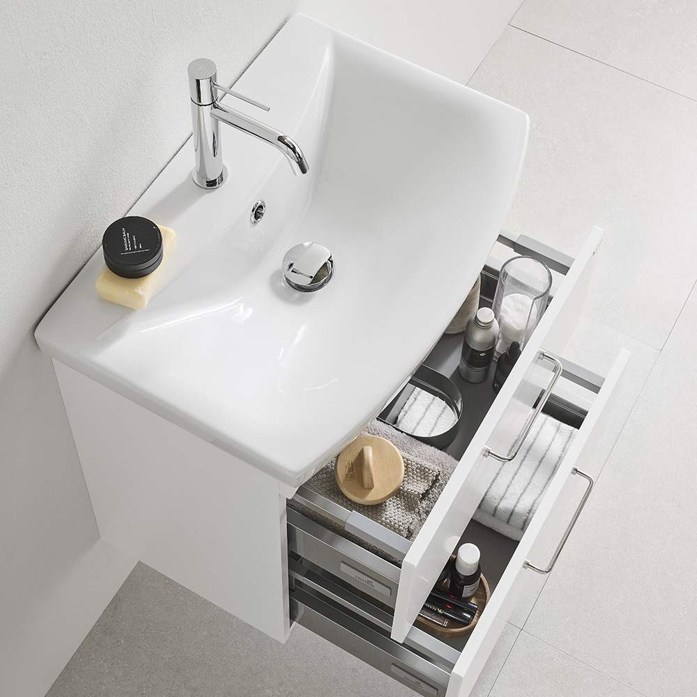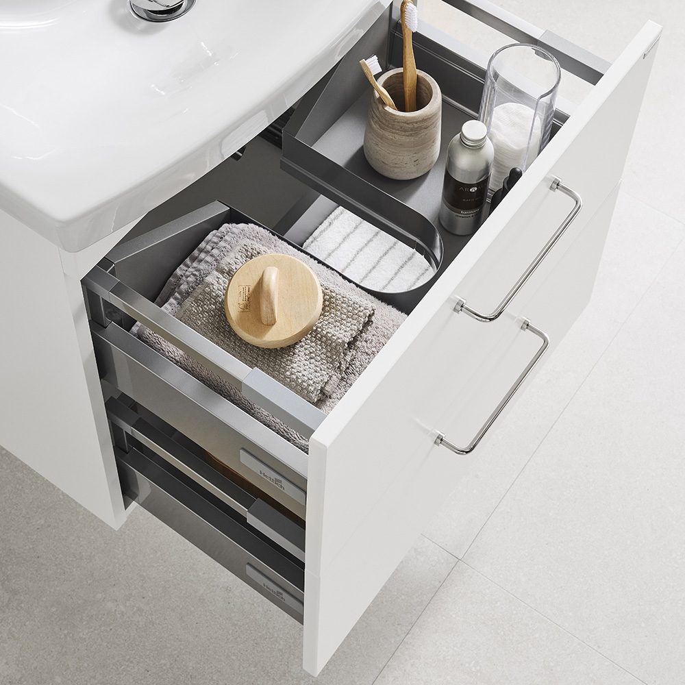 Tvättställsskåp med två mjukstängande lådor. Övre lådan är försedd med en U-konstruktion som lämnar utrymme för vattenlås. Förberett för både golv- och väggavlopp. Justerbara upphängningsbeslag. Levereras färdigmonterad. Komplettera med tvättställ och handtag/knoppar.