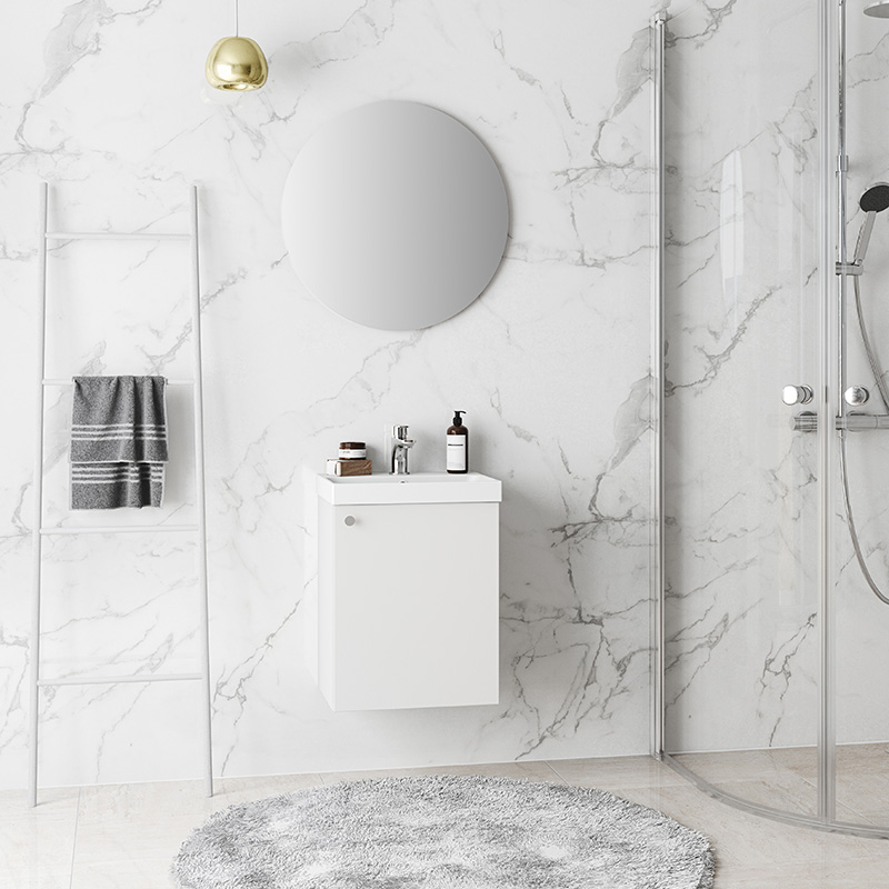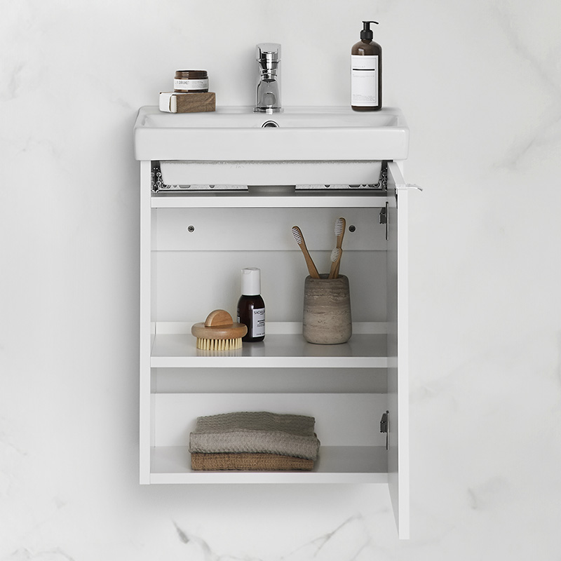 Tvättställsskåp med mjukstängande luckor och ett flyttbart hyllplan. Enkel montering med väggskena och justerbara upphängningsbeslag. Förberett för golv- och väggavlopp. Komplettera med tvättställ och handtag/knoppar.