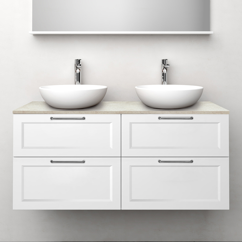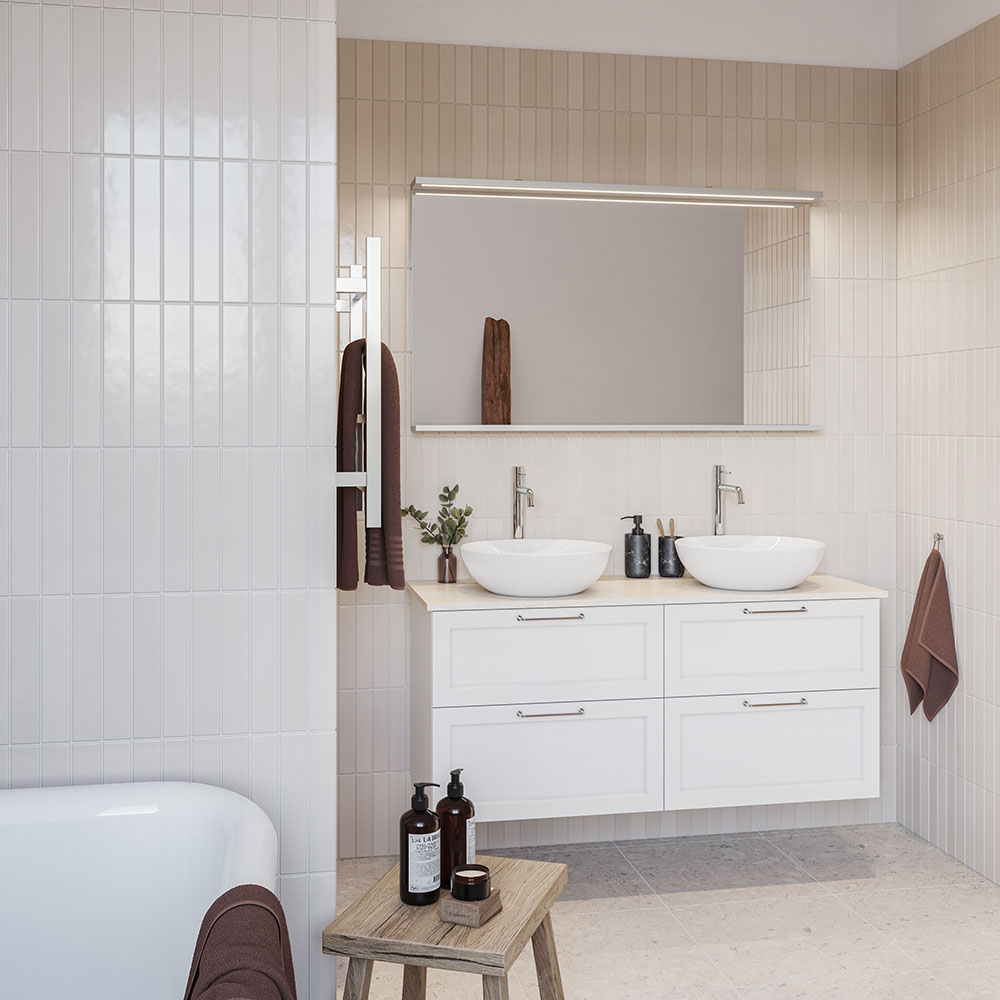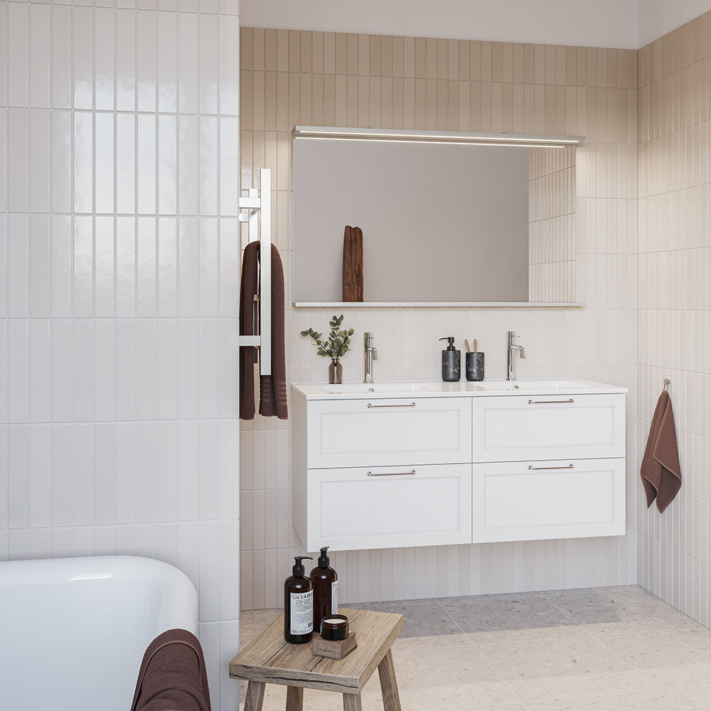 Nejd är en vacker möbel i klassisk stil med ramfronter. Mjukstängande lådor med fullutdrag och lådsidor av metall. En urtagbar matta i botten på lådorna gör att saker står på plats samt underlättar vid rengöring. Övre lådan har en U-konstruktion som lämnar utrymme för vattenlås. Möbeln är förberedd för både golv- och väggavlopp och har justerbara upphängningsbeslag. Finns i vit matt och antracit. Vi rekommenderar avloppssats 200 720 00 som tar liten plats i möbeln. Köp till handtag.