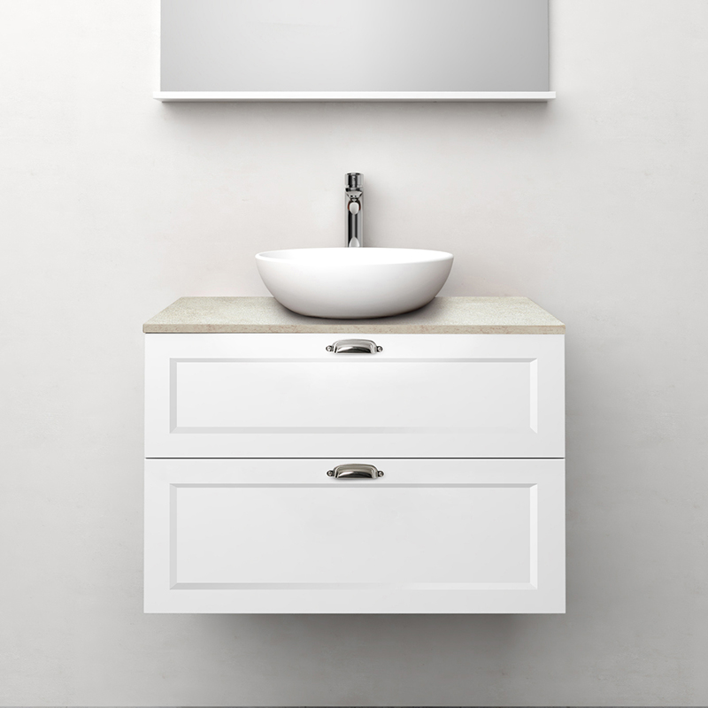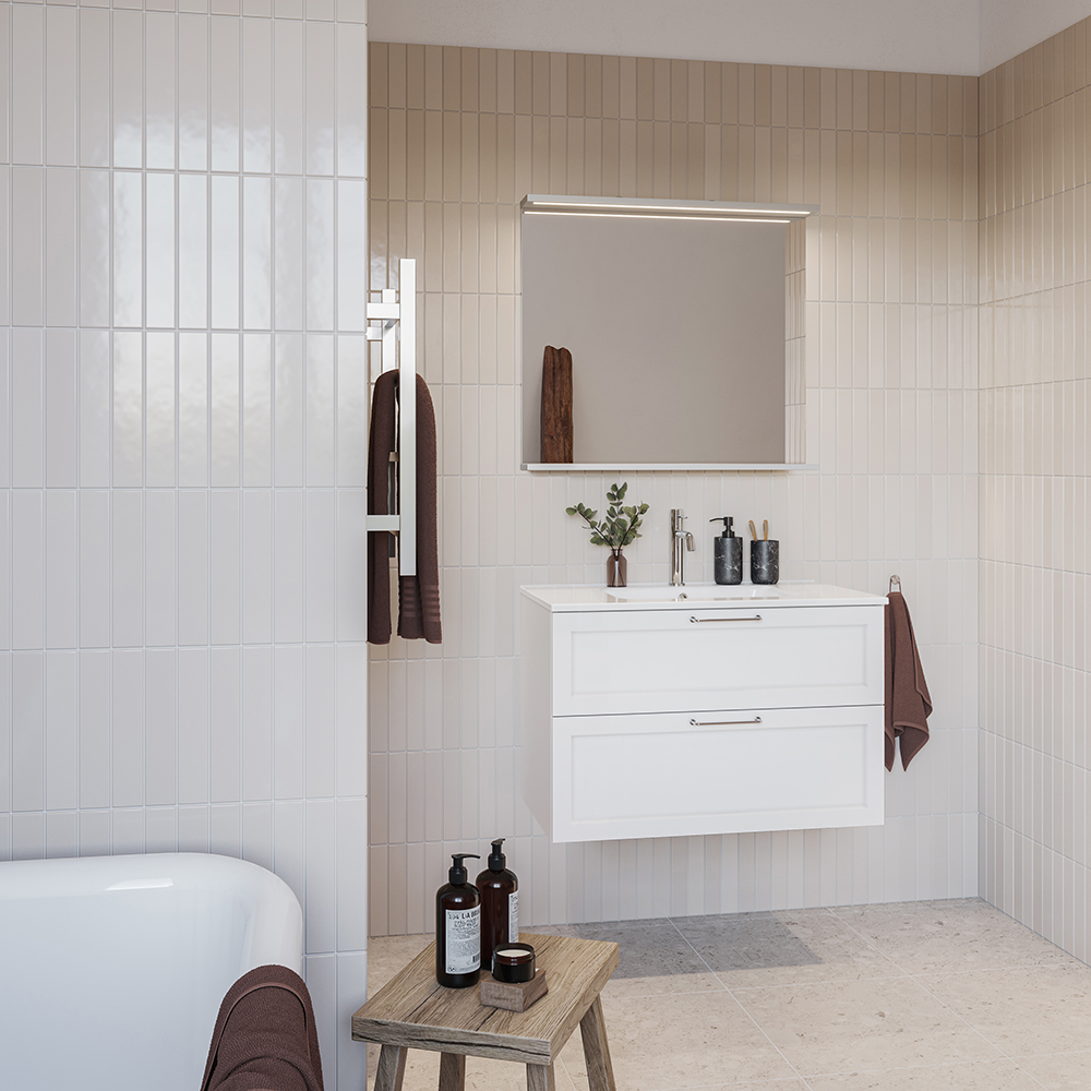 Nejd är en vacker möbel i klassisk stil med ramfronter. Mjukstängande lådor med fullutdrag och lådsidor av metall. En urtagbar matta i botten på lådorna gör att saker står på plats samt underlättar vid rengöring. Övre lådan har en U-konstruktion som lämnar utrymme för vattenlås. Möbeln är förberedd för både golv- och väggavlopp och har justerbara upphängningsbeslag. Finns i vit matt och antracit. Vi rekommenderar avloppssats 200 720 00 som tar liten plats i möbeln. Köp till handtag.