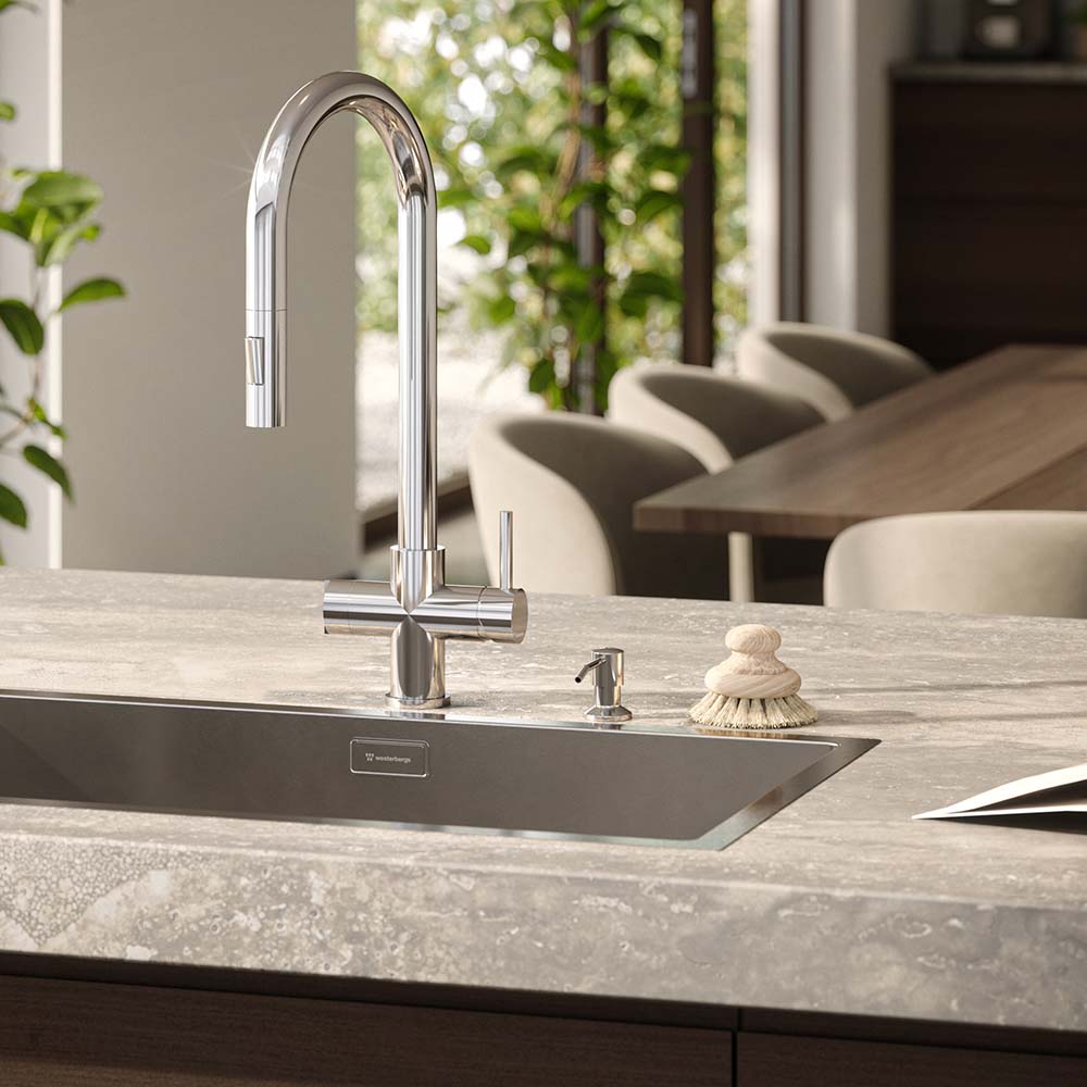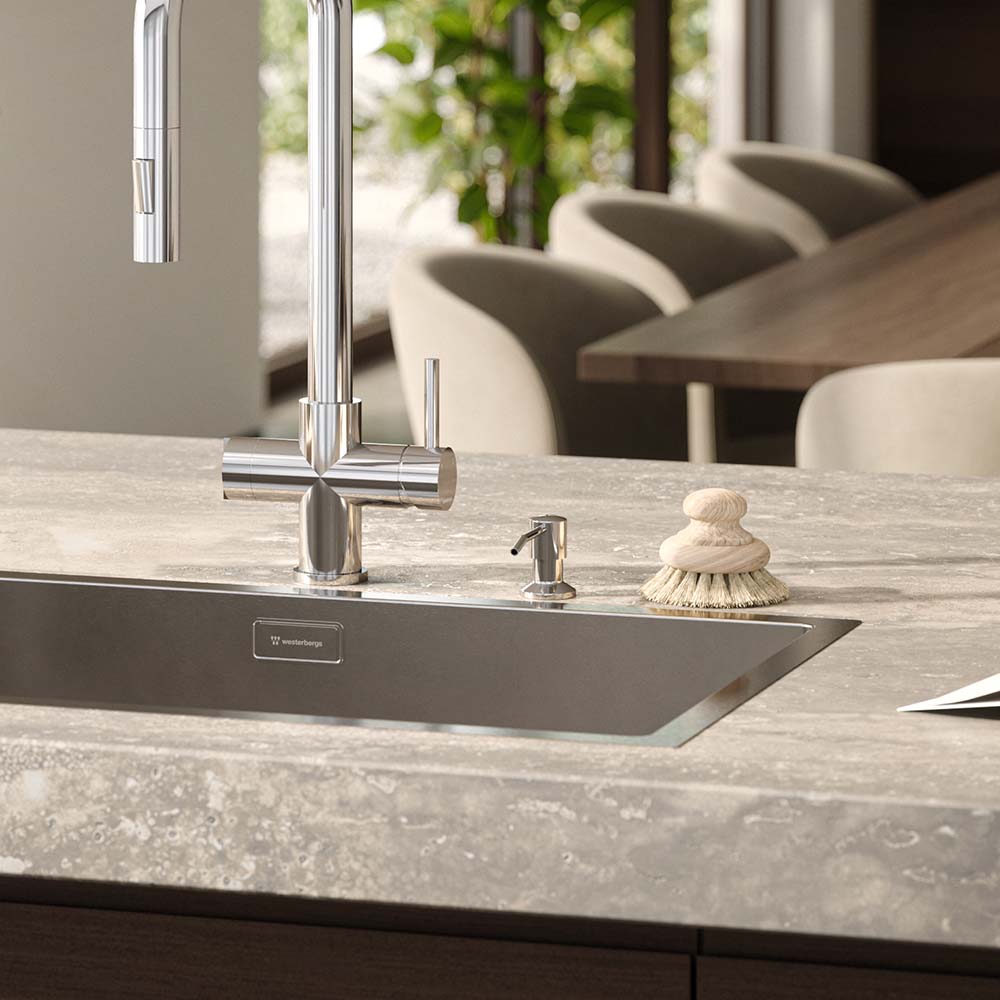 En stilren diskmedelspump som blir en elegant och funktionell detalj vid diskhon. Pumpen monteras direkt i bänkskivan och bidrar till ett mer avskalat och enhetligt uttryck i köket. Diskmedelsbehållaren på 350 ml döljs under bänkskivan.