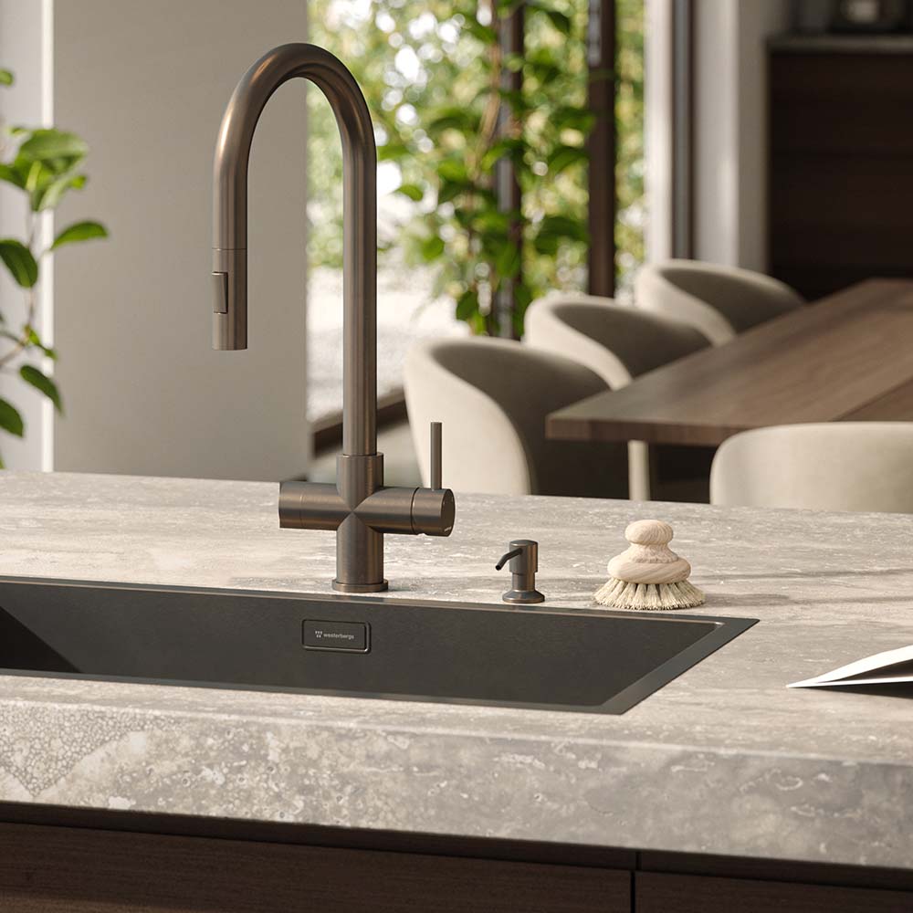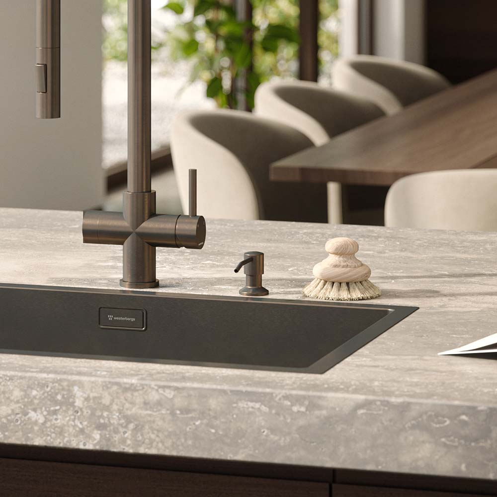 En stilren diskmedelspump som blir en elegant och funktionell detalj vid diskhon. Pumpen monteras direkt i bänkskivan och bidrar till ett mer avskalat och enhetligt uttryck i köket. Diskmedelsbehållaren på 350 ml döljs under bänkskivan.