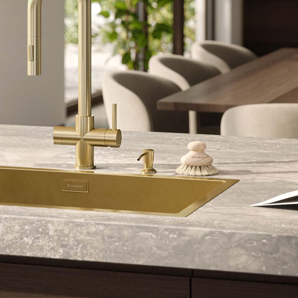 En stilren diskmedelspump som blir en elegant och funktionell detalj vid diskhon. Pumpen monteras direkt i bänkskivan och bidrar till ett mer avskalat och enhetligt uttryck i köket. Diskmedelsbehållaren på 350 ml döljs under bänkskivan.