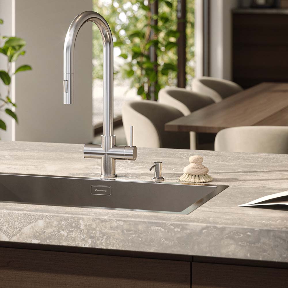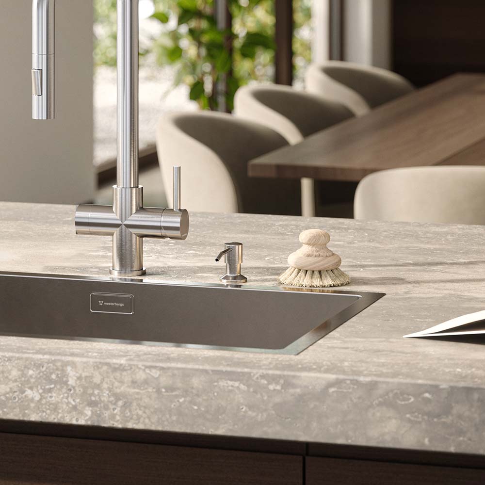 En stilren diskmedelspump som blir en elegant och funktionell detalj vid diskhon. Pumpen monteras direkt i bänkskivan och bidrar till ett mer avskalat och enhetligt uttryck i köket. Diskmedelsbehållaren på 350 ml döljs under bänkskivan.