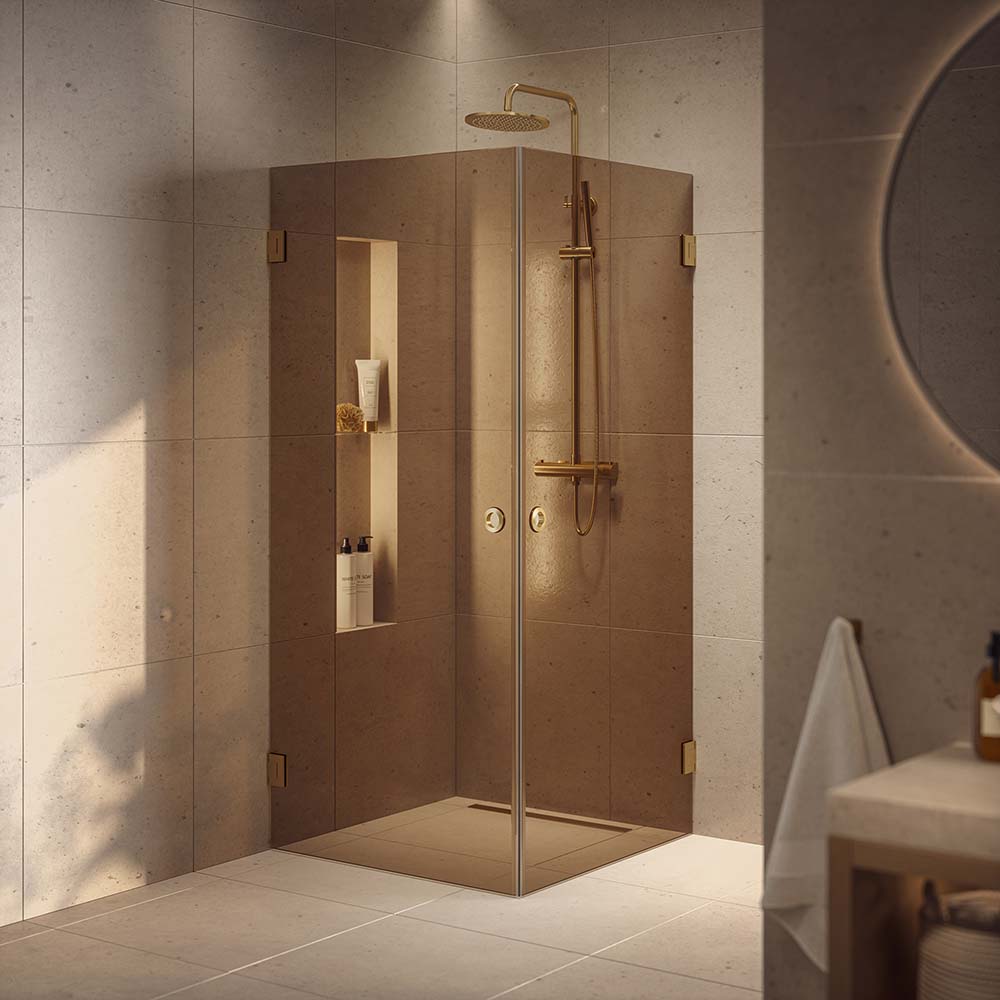 Westerbergs Lynx duschhörn prägla av en avskalad och tidlös design där de stora bronstonade glasytorna står i fokus. Det bronstonade glaset skapar ett rent och luftigt uttryck som ger badrummet en känsla av rymd och elegans.