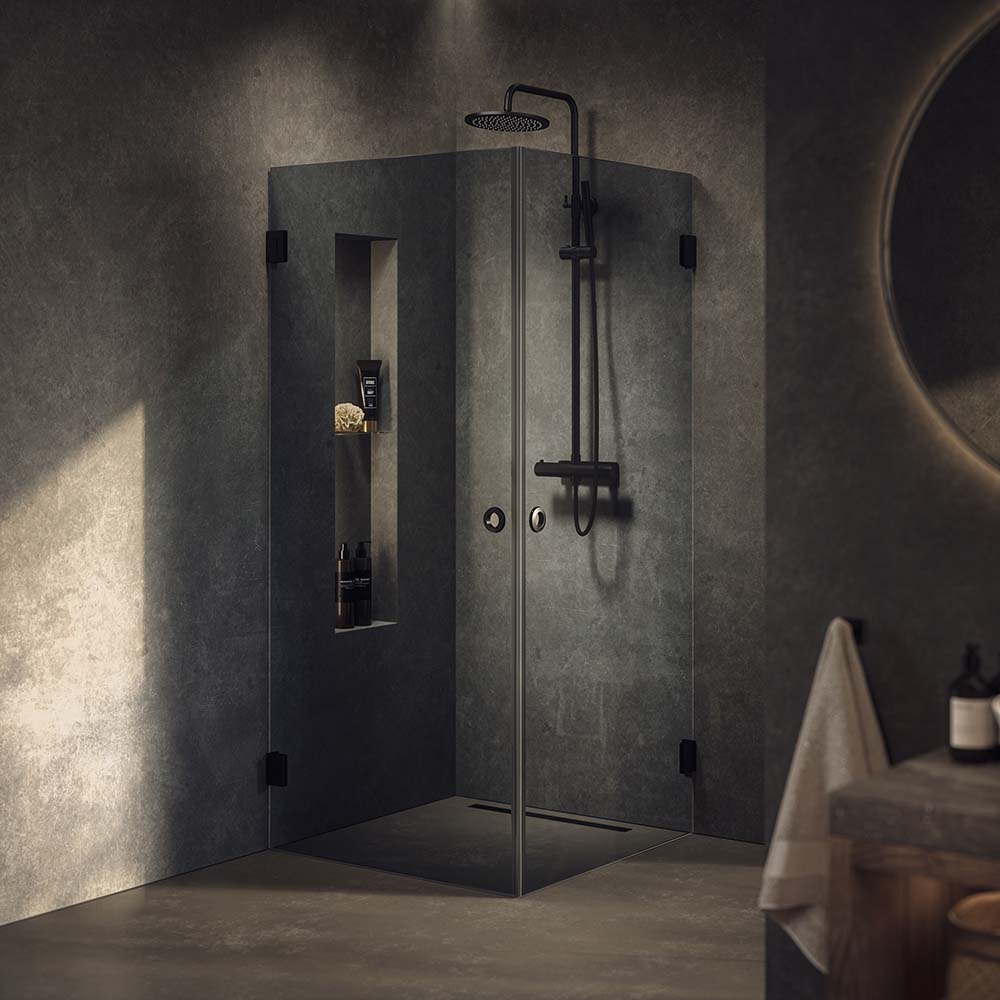 Westerbergs Lynx duschhörn prägla av en avskalad och tidlös design där de stora sotade glasytorna står i fokus. Det sotade glaset skapar ett rent och luftigt uttryck som ger badrummet en känsla av rymd och elegans.