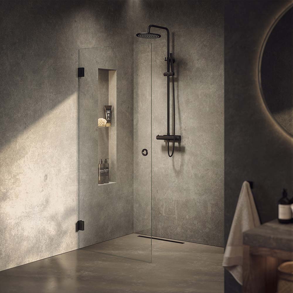 Duschdörren är tillverkad i 8 mm härdat säkerhetsglas och har en elegant, integrerad handtagslösning som förstärker det avskalade intrycket. Lynx duschdörr är vändbar och kan monteras på både höger och vänster sida. För extra flexibilitet kan dörren fällas in mot väggen när den inte används – en genomtänkt, elegant lösning, även för mindre badrum.