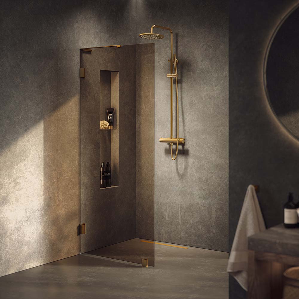 När designen får vara ren och avskalad hamnar det viktigaste i fokus – ljuset, känslan av rymd och glasets elegans. Westerbergs Lynx duschvägg i bronstonat glas är en tidlös duschlösning med premiumkänsla, där stora bronstonade glasytor och smäckra beslag ger badrummet ett öppet och luftigt uttryck.